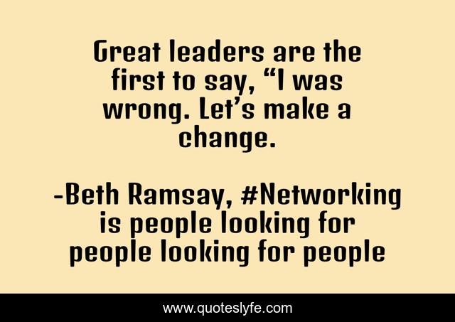 This page presents the quote "Great leaders are the first to say, “I was wrong. Let’s make a change.". Author of this quote is Beth Ramsay, #Networking is people looking for people looking for people. This quote is about wrong, leadership, leader, change, humility,.