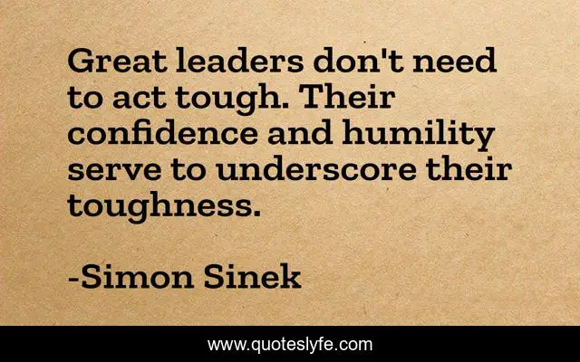 This page presents the quote "Great leaders don't need to act tough. Their confidence and humility serve to underscore their toughness.". Author of this quote is Simon Sinek. This quote is about confidence, humility,.