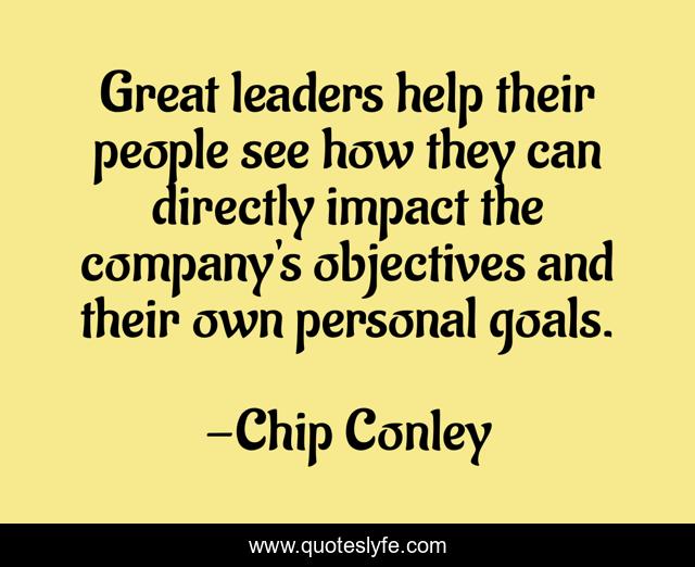 This page presents the quote "Great leaders help their people see how they can directly impact the company's objectives and their own personal goals.". Author of this quote is Chip Conley. This quote is about company, goals, help,.