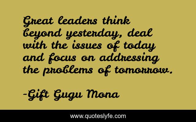 This page presents the quote "Great leaders think beyond yesterday, deal with the issues of today and focus on addressing the problems of tomorrow.". Author of this quote is Gift Gugu Mona. This quote is about address-issues, deal, problems, focus, think, great-leaders, beyond, tomorrow, today,.