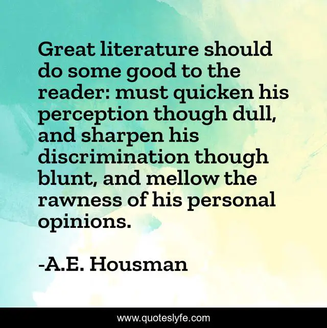This page presents the quote "Great literature should do some good to the reader: must quicken his perception though dull, and sharpen his discrimination though blunt, and mellow the rawness of his personal opinions.". Author of this quote is A.E. Housman. .