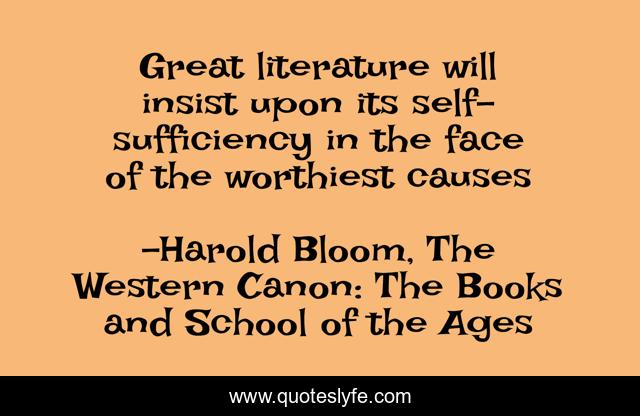 This page presents the quote "Great literature will insist upon its self-sufficiency in the face of the worthiest causes". Author of this quote is Harold Bloom, The Western Canon: The Books and School of the Ages. This quote is about continuity, politics, reading, advocacy, timelessness,.