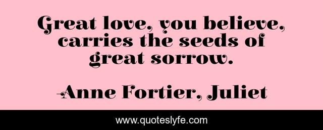 This page presents the quote "Great love, you believe, carries the seeds of great sorrow.". Author of this quote is Anne Fortier, Juliet. This quote is about romeo-and-juliet, love, sorrow, affection, juliet,.