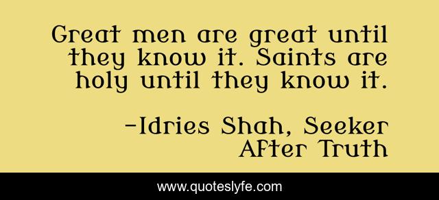 This page presents the quote "Great men are great until they know it. Saints are holy until they know it.". Author of this quote is Idries Shah, Seeker After Truth. This quote is about nafs, piety, religion, sufism, ego, saint, sufis,.