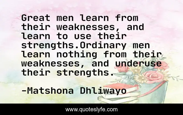 "Matshona Dhliwayo Quotes." Quoteslyfe.com, 2025. Fri. 05 Dec. 2025. <https://www.quoteslyfe.com/quote/Great-men-learn-from-their-weaknesses-and-189968>.