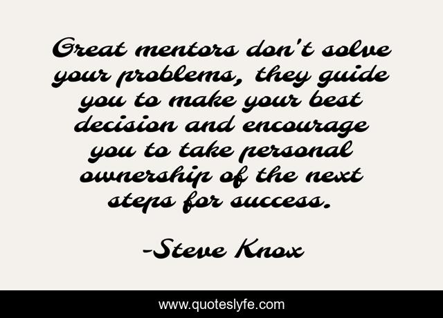 This page presents the quote "Great mentors don't solve your problems, they guide you to make your best decision and encourage you to take personal ownership of the next steps for success.". Author of this quote is Steve Knox. This quote is about mentoring, leadership-development,.