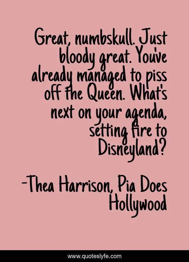 This page presents the quote "Great, numbskull. Just bloody great. You've already managed to piss off the Queen. What's next on your agenda, setting fire to Disneyland?". Author of this quote is Thea Harrison, Pia Does Hollywood. This quote is about urban-fantasy, paranormal-romance,.