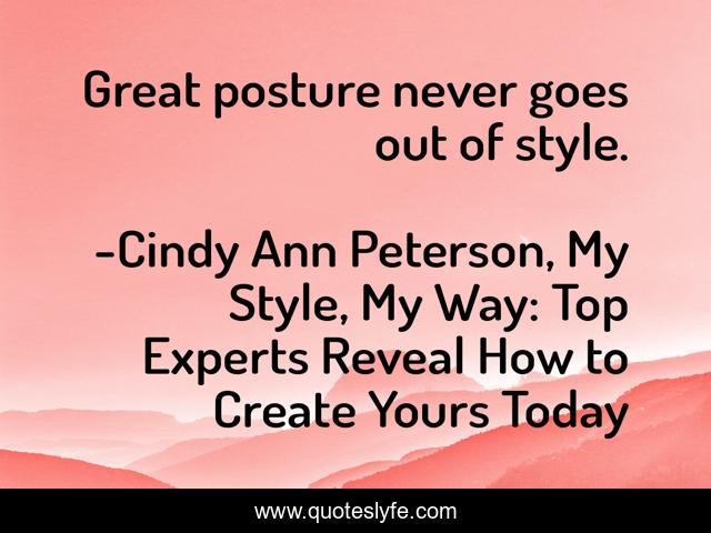 "Cindy Ann Peterson, My Style, My Way: Top Experts Reveal How to Create Yours Today Quotes." Quoteslyfe.com, 2025. Sat. 06 Dec. 2025. <https://www.quoteslyfe.com/quote/Great-posture-never-goes-out-of-style-144351>.