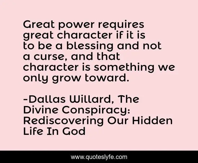 "Dallas Willard, The Divine Conspiracy: Rediscovering Our Hidden Life In God Quotes." Quoteslyfe.com, 2025. Sat. 06 Dec. 2025. <https://www.quoteslyfe.com/quote/Great-power-requires-great-character-if-it-88759>.
