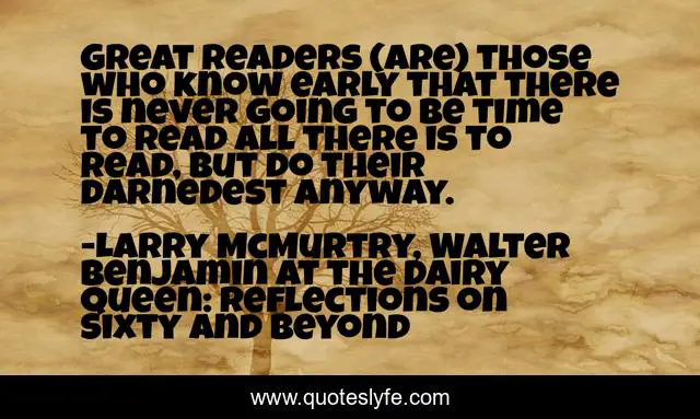 This page presents the quote "Great readers (are) those who know early that there is never going to be time to read all there is to read, but do their darnedest anyway.". Author of this quote is Larry McMurtry, Walter Benjamin at the Dairy Queen: Reflections on Sixty and Beyond. This quote is about books, reading, readers,.