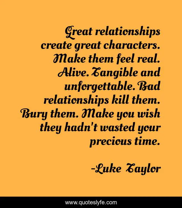 This page presents the quote "Great relationships create great characters. Make them feel real. Alive. Tangible and unforgettable. Bad relationships kill them. Bury them. Make you wish they hadn't wasted your precious time.". Author of this quote is Luke Taylor. This quote is about character-development, relationships, luke-taylor,.
