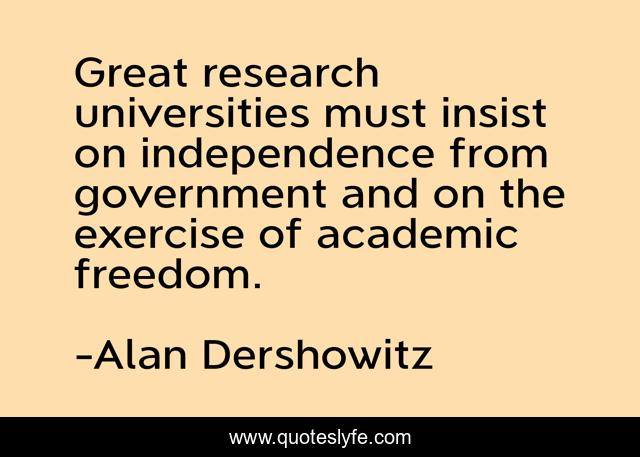 This page presents the quote "Great research universities must insist on independence from government and on the exercise of academic freedom.". Author of this quote is Alan Dershowitz. This quote is about freedom, great, government,.
