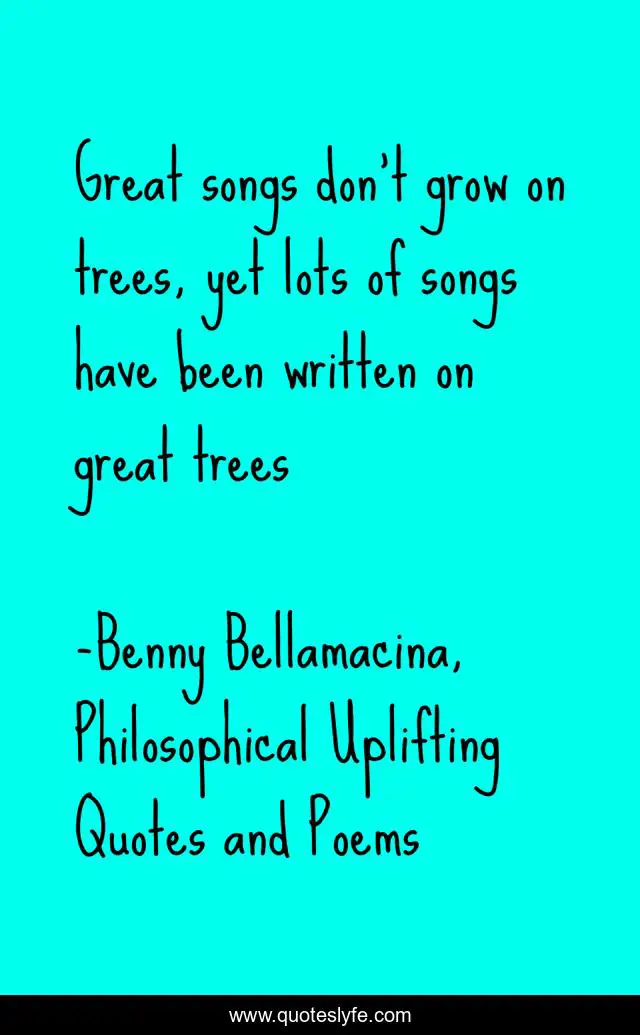 This page presents the quote "Great songs don't grow on trees, yet lots of songs have been written on great trees". Author of this quote is Benny Bellamacina, Philosophical Uplifting Quotes and Poems. This quote is about humour, quote, philosophy, trees, wisdom, songs,.