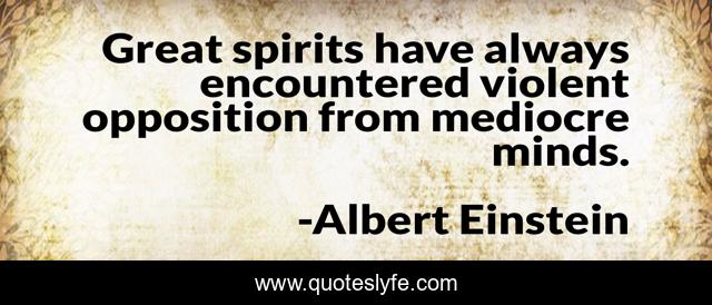 This page presents the quote "Great spirits have always encountered violent opposition from mediocre minds.". Author of this quote is Albert Einstein. This quote is about spirit, opposition, greatness,.