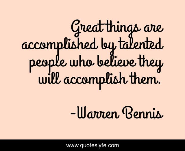 This page presents the quote "Great things are accomplished by talented people who believe they will accomplish them.". Author of this quote is Warren Bennis. This quote is about believe, people,.