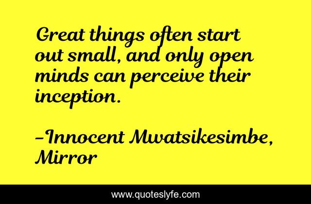 This page presents the quote "Great things often start out small, and only open minds can perceive their inception.". Author of this quote is Innocent Mwatsikesimbe, Mirror. This quote is about confidence, open-mind, success, positive, motivational, self-improvement, inspirational, greatness, enthusiasm,.