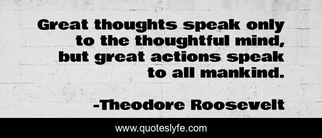 This page presents the quote "Great thoughts speak only to the thoughtful mind, but great actions speak to all mankind.". Author of this quote is Theodore Roosevelt. This quote is about mind, thoughts, speak,.