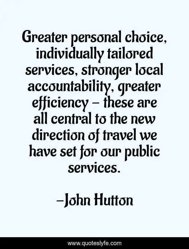 This page presents the quote "Greater personal choice, individually tailored services, stronger local accountability, greater efficiency - these are all central to the new direction of travel we have set for our public services.". Author of this quote is John Hutton. This quote is about choice, accountability,.