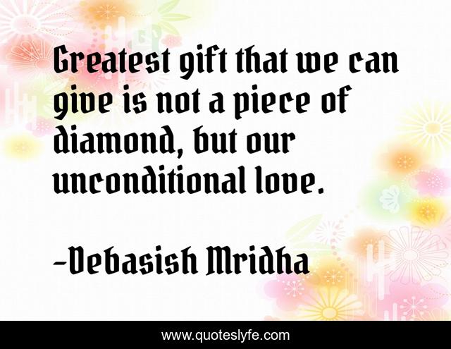 This page presents the quote "Greatest gift that we can give is not a piece of diamond, but our unconditional love.". Author of this quote is Debasish Mridha. This quote is about life, love, knowledge, inspirational, intelligence, philosophy, wisdom, quotes, affection,.