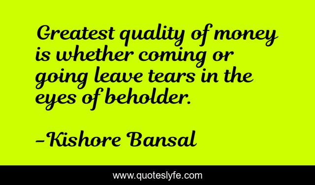This page presents the quote "Greatest quality of money is whether coming or going leave tears in the eyes of beholder.". Author of this quote is Kishore Bansal. This quote is about money, tears, quality,.