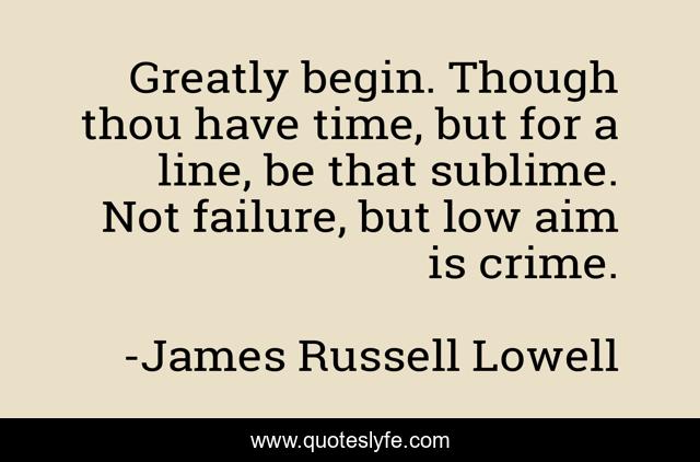 This page presents the quote "Greatly begin. Though thou have time, but for a line, be that sublime. Not failure, but low aim is crime.". Author of this quote is James Russell Lowell. This quote is about aim, time, crime,.