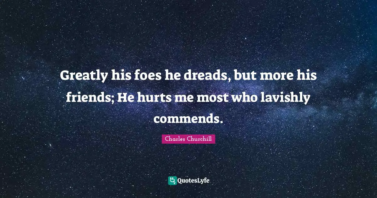This page presents the quote "Greatly his foes he dreads, but more his friends; He hurts me most who lavishly commends.". Author of this quote is Charles Churchill. This quote is about dread, hurt, friends, friendship,.