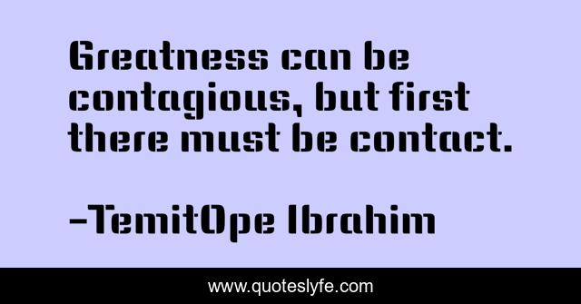 This page presents the quote "Greatness can be contagious, but first there must be contact.". Author of this quote is TemitOpe Ibrahim. This quote is about motivation, insight, mind, optimistic, life-lessons, confidence, positive, priority, greatness,.