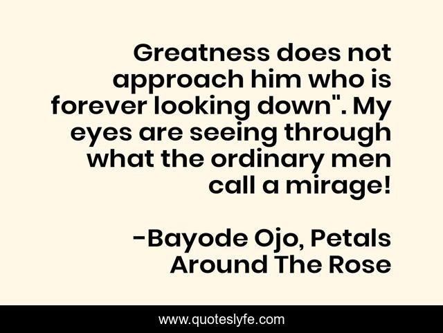 This page presents the quote "Greatness does not approach him who is forever looking down". My eyes are seeing through what the ordinary men call a mirage!". Author of this quote is Bayode Ojo, Petals Around The Rose. This quote is about self-will, greatness,.