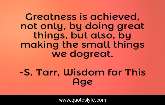 This page presents the quote "Greatness is achieved, not only, by doing great things, but also, by making the small things we dogreat.". Author of this quote is S. Tarr, Wisdom for This Age. This quote is about small, big, inspiration, greatness, wisdom,.