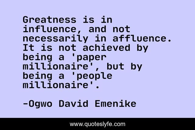 This page presents the quote "Greatness is in influence, and not necessarily in affluence. It is not achieved by being a 'paper millionaire', but by being a 'people millionaire'.". Author of this quote is Ogwo David Emenike. This quote is about affluence, greatness, influence, inspirational, enthusiasm,.