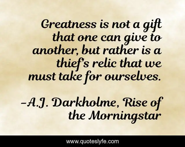 This page presents the quote "Greatness is not a gift that one can give to another, but rather is a thief's relic that we must take for ourselves.". Author of this quote is A.J. Darkholme, Rise of the Morningstar. This quote is about confidence, relic, gift, giving, greatness, thief, act, confident, determination,.