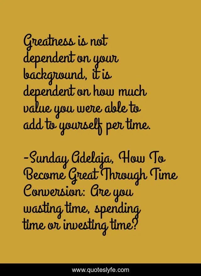 This page presents the quote "Greatness is not dependent on your background, it is dependent on how much value you were able to add to yourself per time.". Author of this quote is Sunday Adelaja, How To Become Great Through Time Conversion: Are you wasting time, spending time or investing time?. This quote is about life, self-worth, conversion, productivity, wealth, self-value, greatness, waste, humanity,.