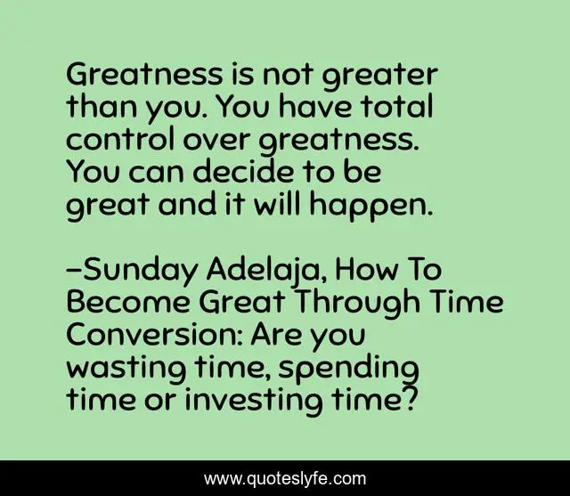 This page presents the quote "Greatness is not greater than you. You have total control over greatness. You can decide to be great and it will happen.". Author of this quote is Sunday Adelaja, How To Become Great Through Time Conversion: Are you wasting time, spending time or investing time?. This quote is about control, life, conversion, productivity, wealth, decision, reality, greatness, control-over-greatness,.
