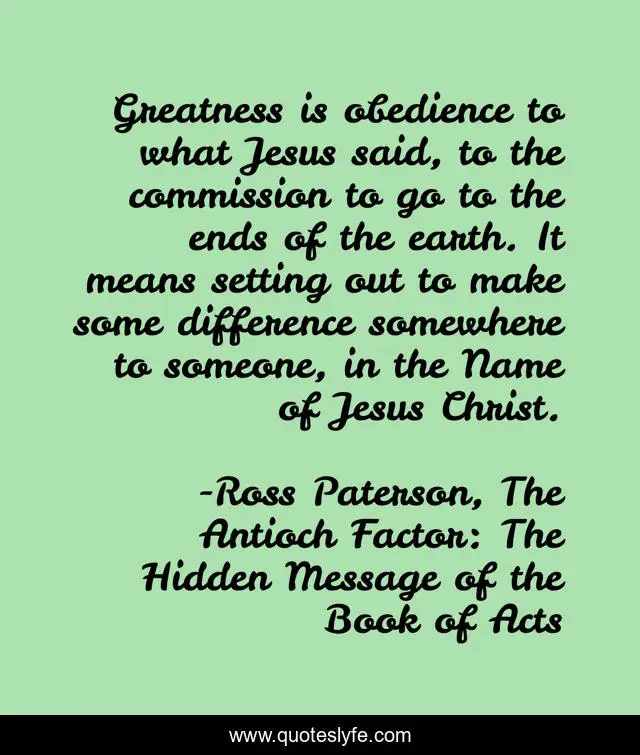 "Ross Paterson, The Antioch Factor: The Hidden Message of the Book of Acts Quotes." Quoteslyfe.com, 2025. Sat. 06 Dec. 2025. <https://www.quoteslyfe.com/quote/Greatness-is-obedience-to-what-Jesus-said-134807>.