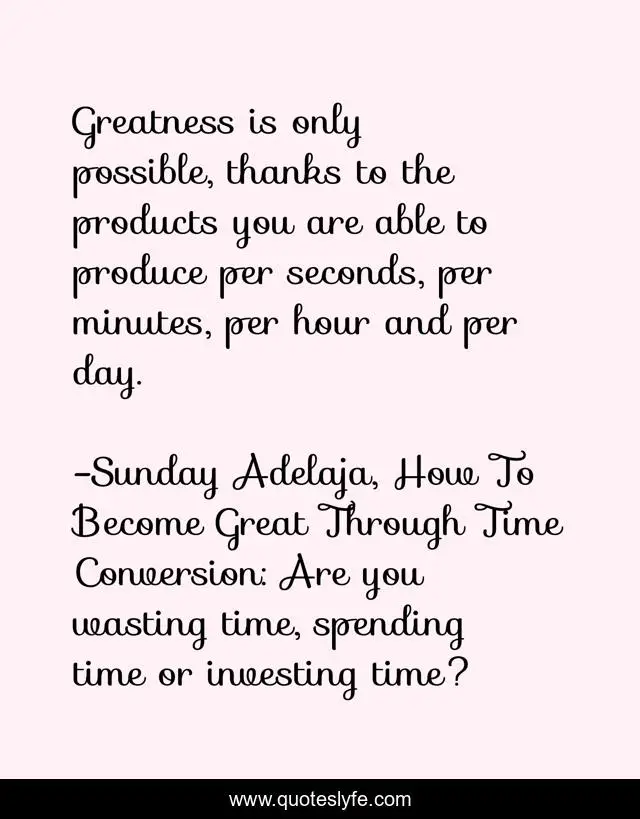 "Sunday Adelaja, How To Become Great Through Time Conversion: Are you wasting time, spending time or investing time? Quotes." Quoteslyfe.com, 2025. Fri. 05 Dec. 2025. <https://www.quoteslyfe.com/quote/Greatness-is-only-possible-thanks-to-the-39293>.