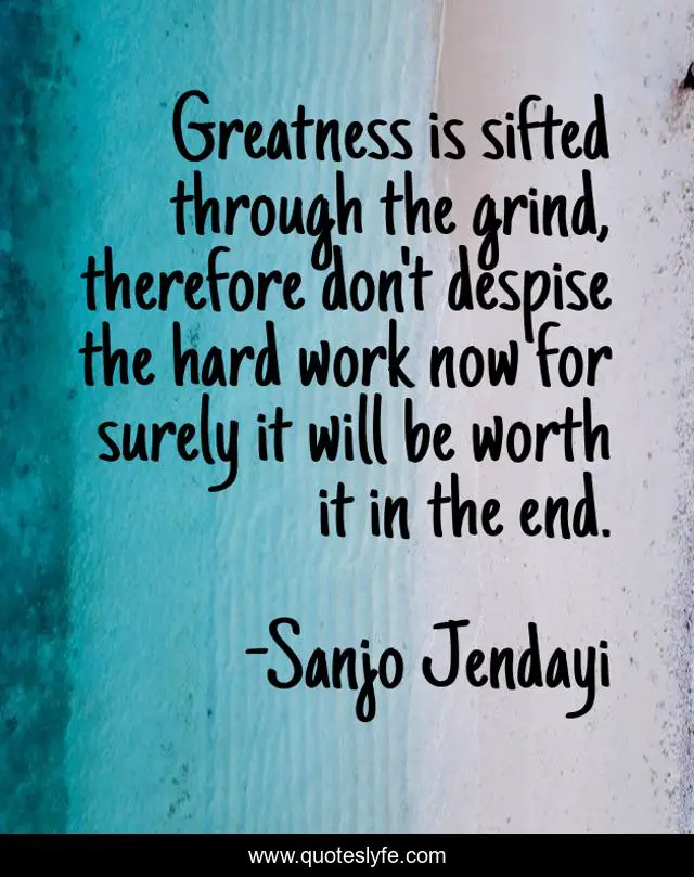 This page presents the quote "Greatness is sifted through the grind, therefore don't despise the hard work now for surely it will be worth it in the end.". Author of this quote is Sanjo Jendayi. This quote is about great, hard-work, sanjo-jendayi, grind, deserie-johnson, greatness, worth,.