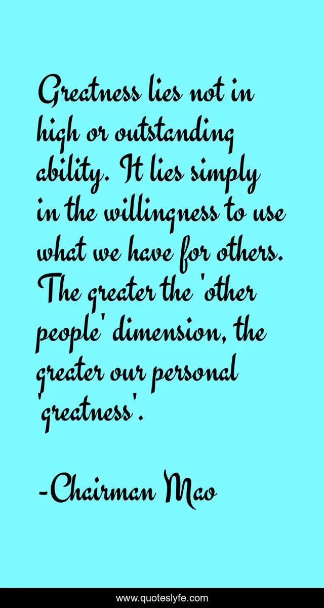 This page presents the quote "Greatness lies not in high or outstanding ability. It lies simply in the willingness to use what we have for others. The greater the 'other people' dimension, the greater our personal 'greatness'.". Author of this quote is Chairman Mao. .
