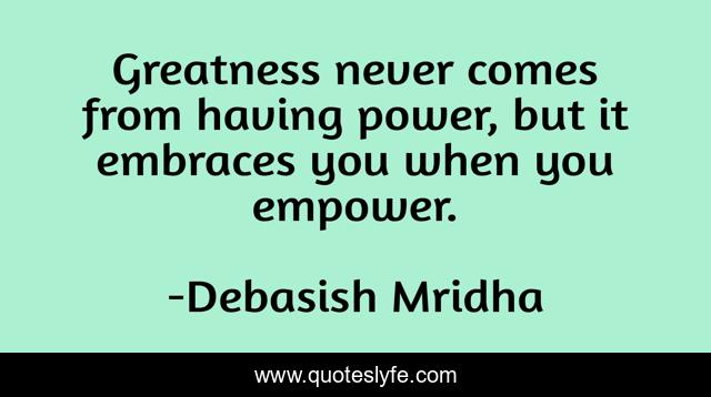 This page presents the quote "Greatness never comes from having power, but it embraces you when you empower.". Author of this quote is Debasish Mridha. This quote is about life, love, knowledge, inspirational, intelligence, philosophy, wisdom, quotes, affection,.