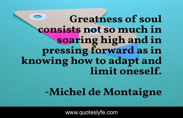 This page presents the quote "Greatness of soul consists not so much in soaring high and in pressing forward as in knowing how to adapt and limit oneself.". Author of this quote is Michel de Montaigne. .
