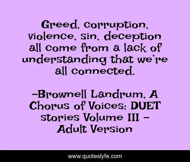"Brownell Landrum, A Chorus of Voices: DUET stories Volume III - Adult Version Quotes." Quoteslyfe.com, 2025. Tue. 09 Dec. 2025. <https://www.quoteslyfe.com/quote/Greed-corruption-violence-sin-deception-all-come-177901>.