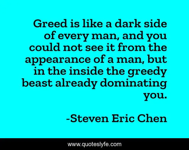 This page presents the quote "Greed is like a dark side of every man, and you could not see it from the appearance of a man, but in the inside the greedy beast already dominating you.". Author of this quote is Steven Eric Chen. This quote is about mankind, greed,.