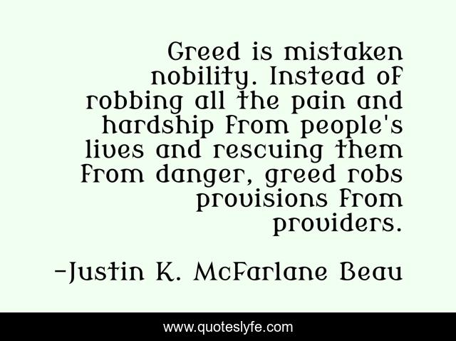 This page presents the quote "Greed is mistaken nobility. Instead of robbing all the pain and hardship from people's lives and rescuing them from danger, greed robs provisions from providers.". Author of this quote is Justin K. McFarlane Beau. This quote is about noble, pain, hardship, providers, danger, nobility, provision, greed,.
