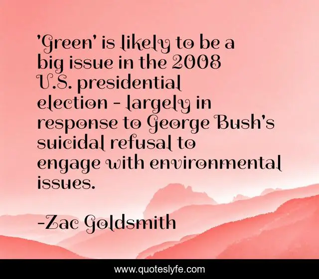 This page presents the quote "'Green' is likely to be a big issue in the 2008 U.S. presidential election - largely in response to George Bush's suicidal refusal to engage with environmental issues.". Author of this quote is Zac Goldsmith. This quote is about green, election, response,.