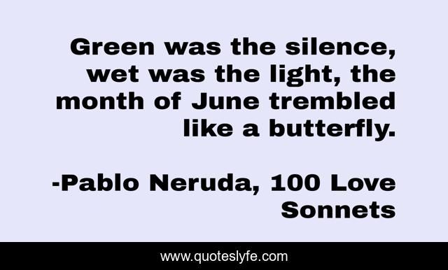 This page presents the quote "Green was the silence, wet was the light, the month of June trembled like a butterfly.". Author of this quote is Pablo Neruda, 100 Love Sonnets. This quote is about summer, atmosphere, love-poetry, light, june, poetry, silence,.