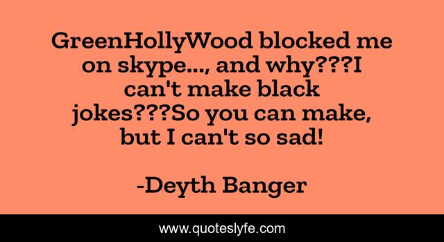 This page presents the quote "GreenHollyWood blocked me on skype..., and why???I can't make black jokes???So you can make, but I can't so sad!". Author of this quote is Deyth Banger. This quote is about blocked, greenhollywood, skype, why, sad,.