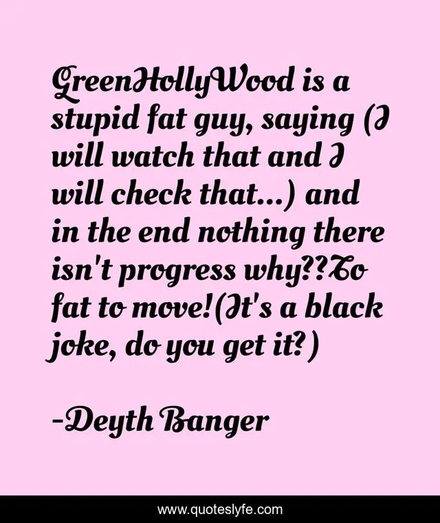 This page presents the quote "GreenHollyWood is a stupid fat guy, saying (I will watch that and I will check that...) and in the end nothing there isn't progress why??To fat to move!(It's a black joke, do you get it?)". Author of this quote is Deyth Banger. This quote is about saying, sayings, greenhollywood, move, it, fat, stupid, nothing, get,.