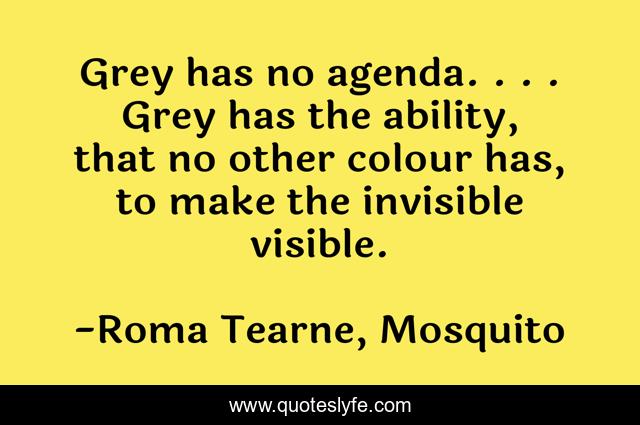 This page presents the quote "Grey has no agenda. . . . Grey has the ability, that no other colour has, to make the invisible visible.". Author of this quote is Roma Tearne, Mosquito. This quote is about color, perception, art,.