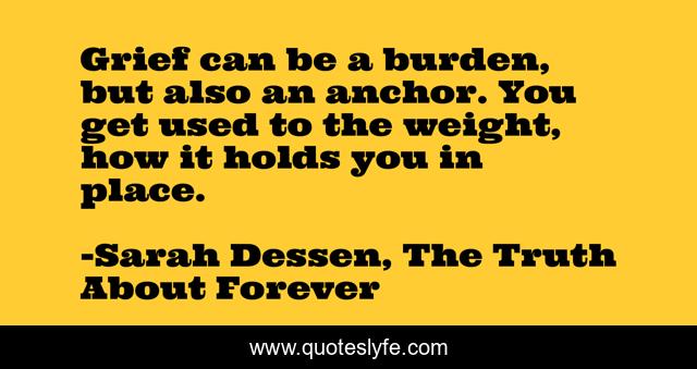 This page presents the quote "Grief can be a burden, but also an anchor. You get used to the weight, how it holds you in place.". Author of this quote is Sarah Dessen, The Truth About Forever. This quote is about grief, bereavement,.