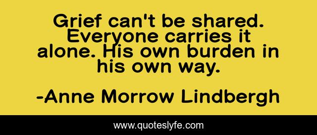 This page presents the quote "Grief can't be shared. Everyone carries it alone. His own burden in his own way.". Author of this quote is Anne Morrow Lindbergh. This quote is about alone, grief, way,.