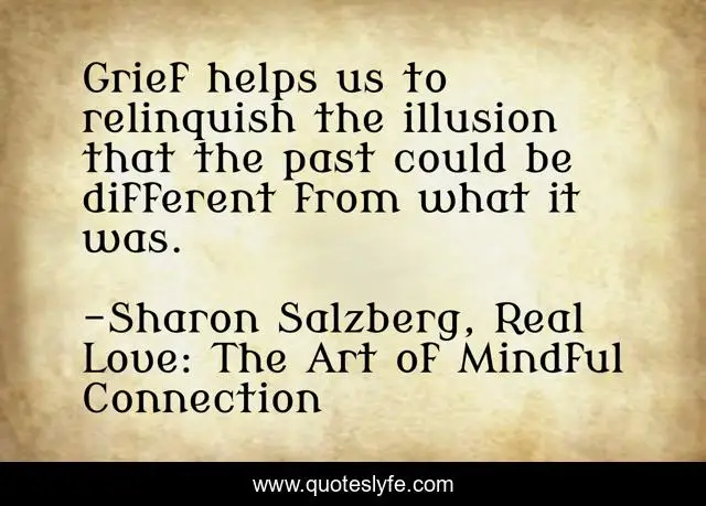 This page presents the quote "Grief helps us to relinquish the illusion that the past could be different from what it was.". Author of this quote is Sharon Salzberg, Real Love: The Art of Mindful Connection. This quote is about death, letting-go, realtionships, grief-and-loss, grief, real-love, illusion,.